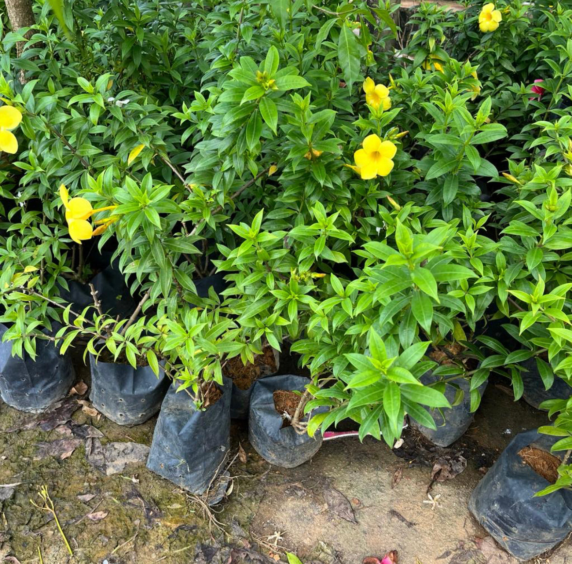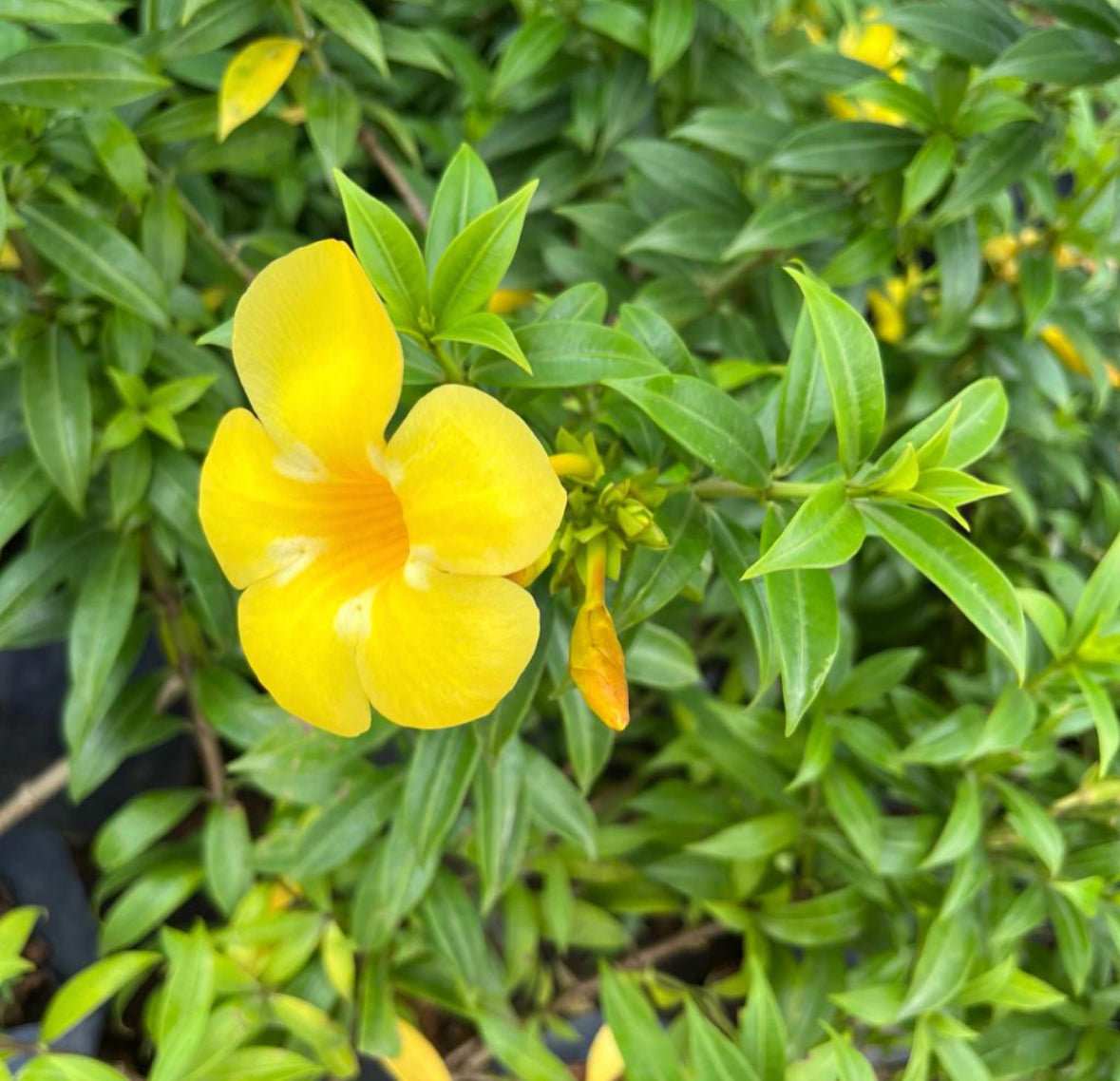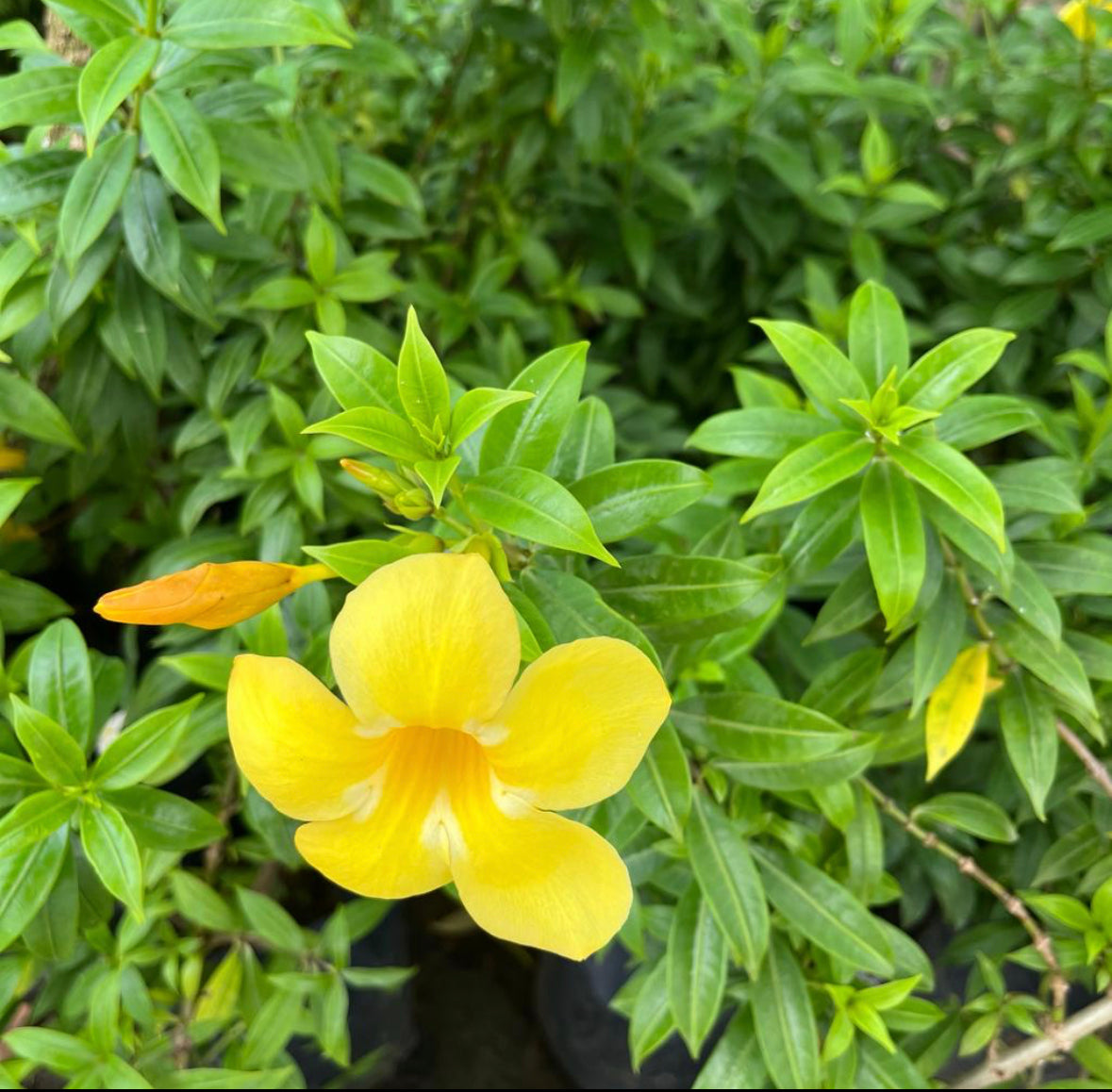 The Allamada Trumpet Vine, often referred to as the Golden Trumpet Vine, is known for its vibrant, trumpet-shaped yellow flowers that bloom in clusters.