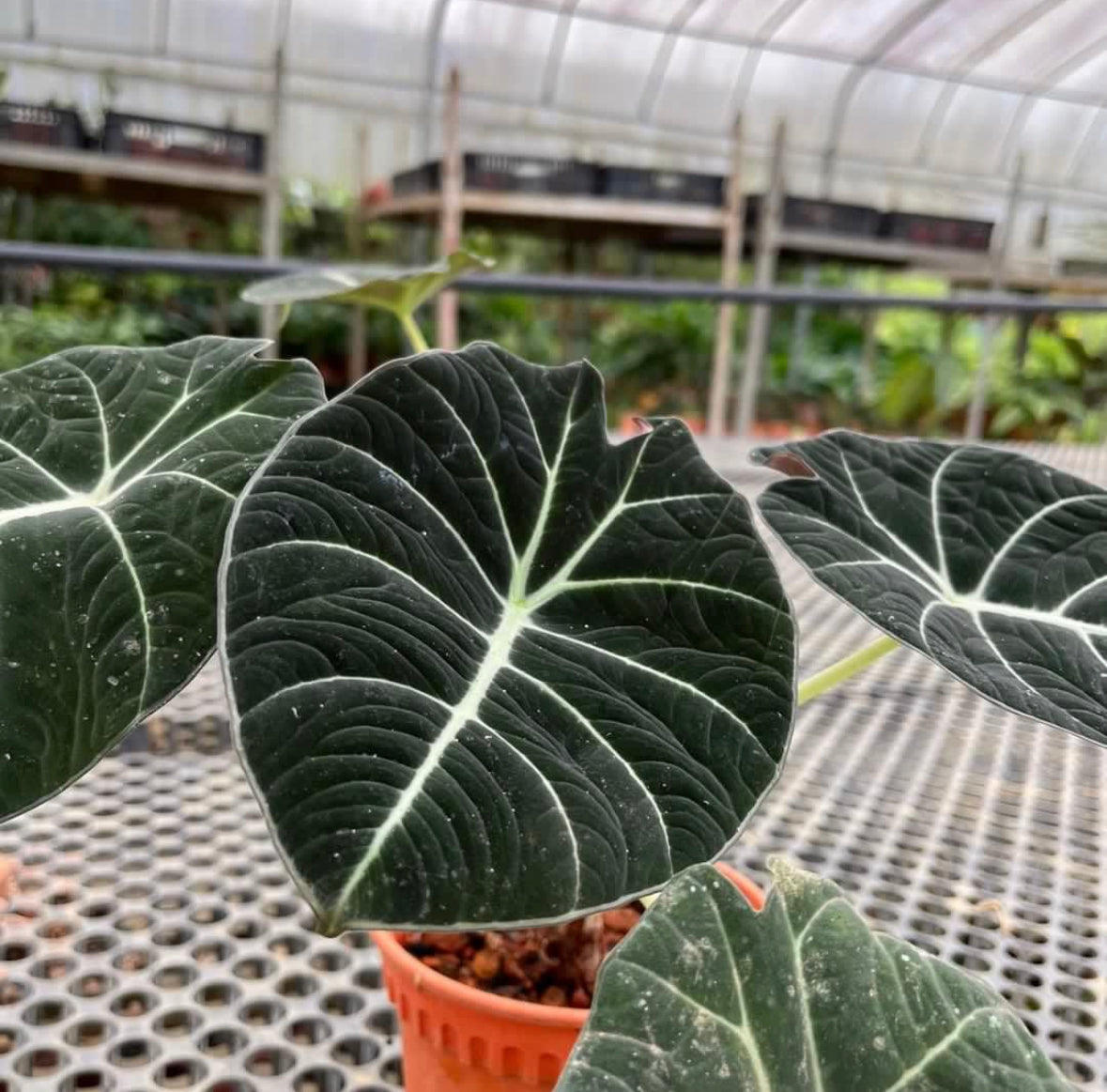Alocasia Reginula 'Tabin', also known as the Black Velvet Alocasia, is a stunning houseplant known for its striking, dark green leaves that have a velvety texture. The leaves are often marked with prominent white veins, creating a beautiful contrast.