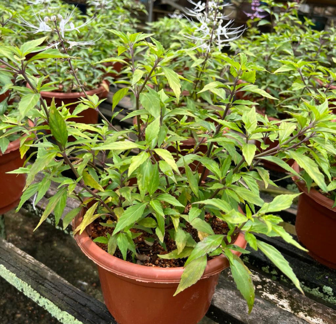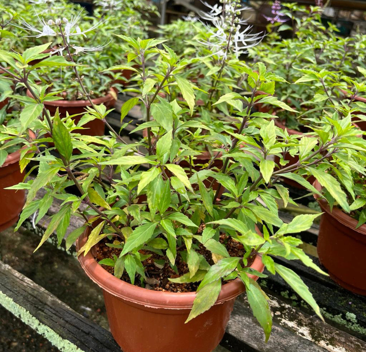Orthosiphon Aristatus, commonly known as Cat's Whiskers White is a charming perennial herb known for its striking, whisker-like white flowers and lush foliage.