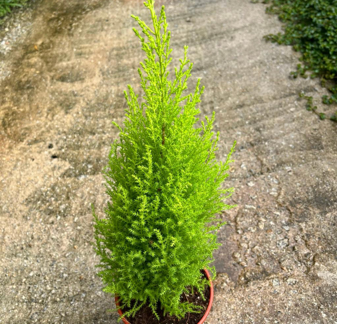 Cupressus Macrocarpa 'Goldcrest', commonly known as Monterey Cypress, is a striking evergreen conifer valued for its dense, soft, scale-like leaves that are bright golden yellow to lime green.