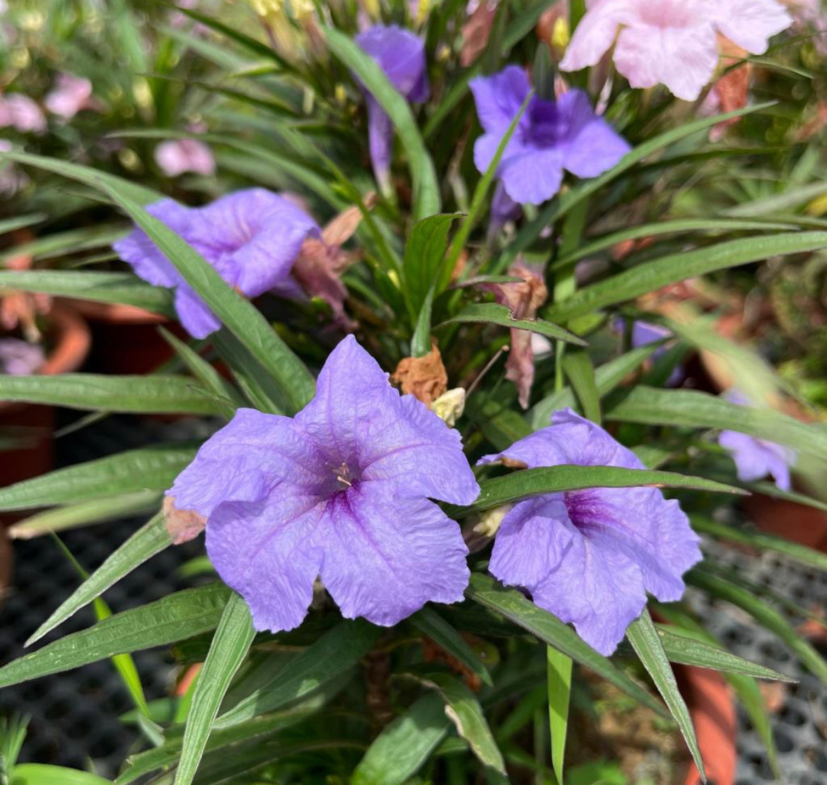 Ruellia Simplex 'Katie', has lush, green leaves and produces numerous trumpet-shaped flowers that bloom in shades of purple or violet.
