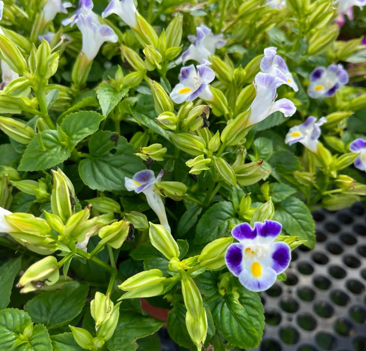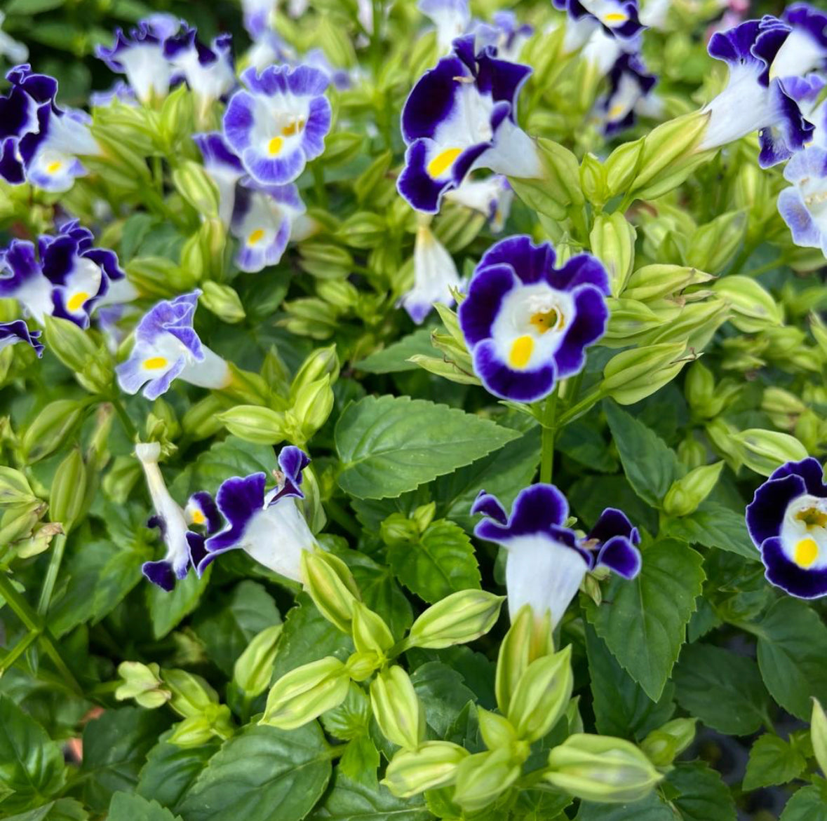 Torenia Dark Blue, also known as the Wishbone Flower, has dark blue blooms that are tubular and shaped like a wishbone, often with contrasting markings in yellow or white.