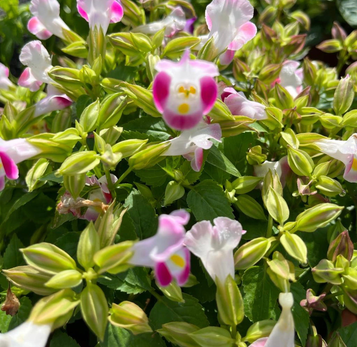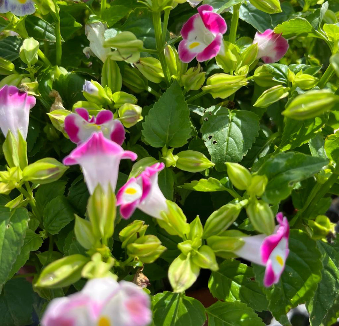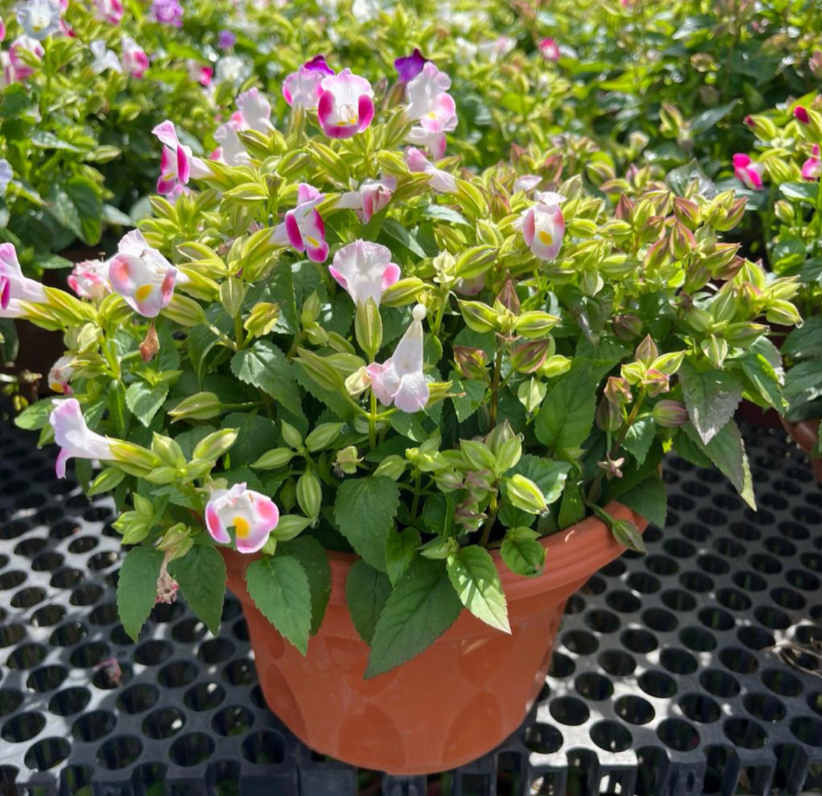 Torenia Pink, also known as the Wishbone Flower, has pink blooms that are tubular and shaped like a wishbone, often with contrasting markings in yellow or white.